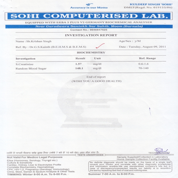 esjk S. Creatinine 2.0 FkkA ,l ih gsyFkds;j lsuVj okyksa us fcYdqy Bhd fd;kA esjk ne p<+rk FkkA eksVkik Fkk] iSjksa ij lkst FkhA fcYdqy Bhd gks xbZ] otu 5 fdyks ?kVkA